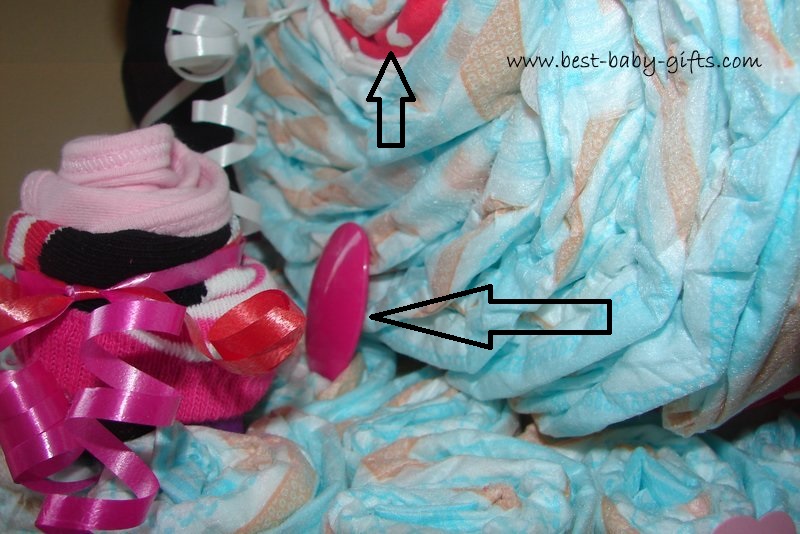 Tip: if you do not want to make sock roses just use the spoons and some curly ribbon to make your diaper cake more lively and colorful.