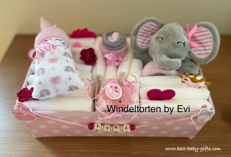 #ad Cute personalized elephant onesie to include in your elephant baby gift.It's really quite easy to find baby things with elephant design, both for girls and for boys. And this foldable rectangle cloth storage organizer in pink polka dot is ideal to combine with gray, pink and white items. I folded the diapers and left space to stuff my items, such as the sock rose, in between. The diaper baby has a wash cloth with little elephants on and the elephant security blanket is mainly hidden between the diapers with just the head sticking out. Lots of little decoration items such as the pacifier, a felt heart, a princess crown and paper flowers stuck between the diapers make this baby girl gift complete.
