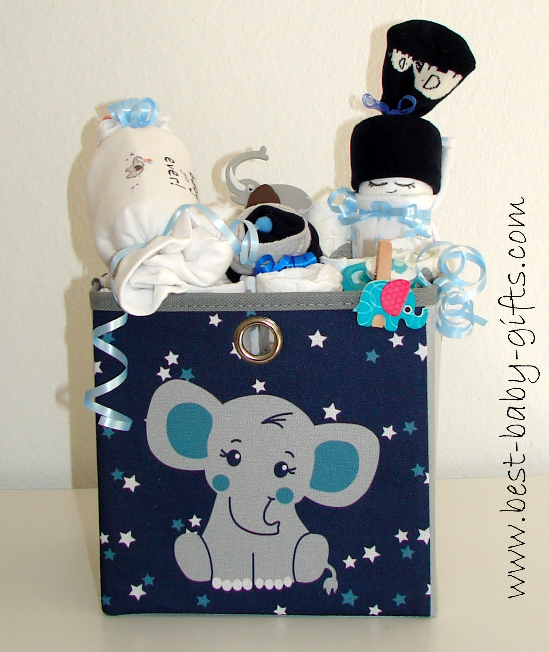 The main elephant piece of this diaper gift is the storage box with a big elephant printed on. It's filled with a diaper pack. The items I have used to complete the elephant design are a baby onesie with a little elephant printed on (rolled around a diaper and ends tied with ribbons so it looks just like a huge candy), an elephant pacifier, elephant baby socks and an elephant wash cloth (used for the diaper baby) as well as a little elephant peg and a little foam elephant.