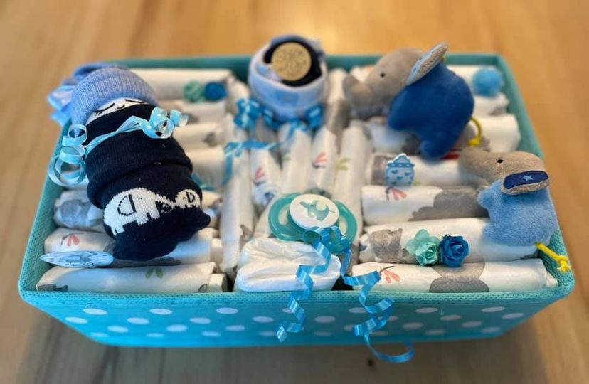 The big advantage of this kind of diaper cakes is also that baby will have all the "elephant items" to keep and a cuddly elephant to play with while if you make an elephant shaped diaper cake it will be gone once the diapers will be used up on baby.