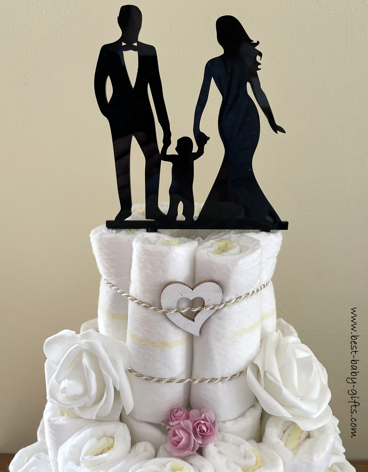 cute diaper cake topper: couple with babyThe wedding diaper cake looked even more stunning and elegant once it was wrapped in foil. Since I was not sure how transport in our car and on the freeway would work out I left the foil open on top. So had it been necessary, I could have quickly rearranged the items on the cake. But everything stayed in place perfectly and no harm was done so I did not even need this precautionary life hack.