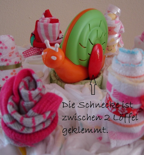 Die Rappel-Schnecke von Voggenreiter ist einfach mit dem oberen Teil von 2 Babylöffeln, die in das Moltontuch bzw. die Windeln gesteckt wurden, fixiert. Sie wurde zwischen die 2 Löffel geklemmt und steckt dort nun ohne weitere Fixierung 'bombensicher' fest. |
