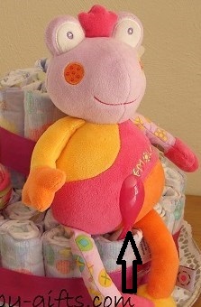 Bei dieser 2-stöckigen Windeltorte ist das Kuscheltier an der 2ten Etage angelehnt und wird vorne von einem Babylöffel gehalten. Auch hier ist das Spielzeug zwischen die Windeln der 2. Etage und den Löffel geklemmt und hält ohne jede weitere Befestigung. |