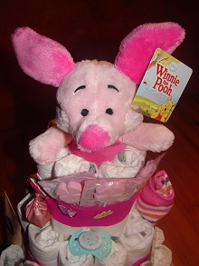Die Spitze der Windeltorte ist leicht und vielfältig dekorierbar. Ein Stofftier oder Schnuffeltuch und ähnliches kann z.B. ganz einfach oben hineingesteckt werden und sitzt dann ganz sicher dort oben.