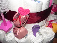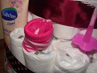 Aus gewickelten und umgestülpten Babysöckchen kann man Blütenköpfe basteln und diese dann mithilfe eines Babylöffels zwischen die Windeln stecken. An Babylöffeln kann man auch gut effektvolle Schleifen befestigen, falls man nicht zuviel Geld für 'Torten-Accessoires' ausgeben möchte. Bunte Babylöffel gibt es übrigens in gut sortierten Drogerien im 5er Pack zu kaufen.